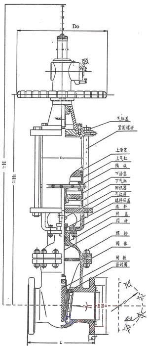 1、本閥主要由閥體、閥蓋、閘闆、閥杆、密封圈、雙層氣缸及其活塞、活塞杆、隔闆連同緩沖機構、手動機構、氣動-手動轉換裝置和閥蓋填料裝置等部分組成。