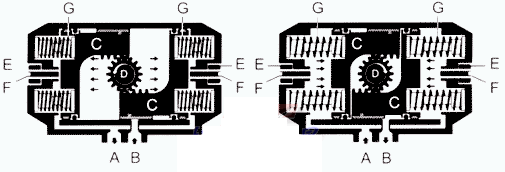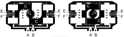 壓縮空氣從氣口(B)進入氣缸兩活塞(C)之間中腔時,使兩活塞分離向氣缸兩端方向移動,兩端氣腔的空氣通過氣口(A)排出,同時使兩活塞(C)的齒條同步帶動輸出軸(D)(齒輪)逆時針方向旋轉90度。可以👿從兩端調整微量角度,松動螺母(E)用内六角扳手擰動調節螺栓👱🏼♂️(F)調整所需角度,鎖緊螺母(E)。反之壓縮空氣則從氣口(A)進入氣缸兩端氣腔時,使兩活👧🏾塞向氣缸中間方向移動,中間氣腔的空氣通過氣口(B)排出,同時使兩活塞(C)的齒條同步帶動輸出軸(D)(齒輪)順時針方向旋轉90度。